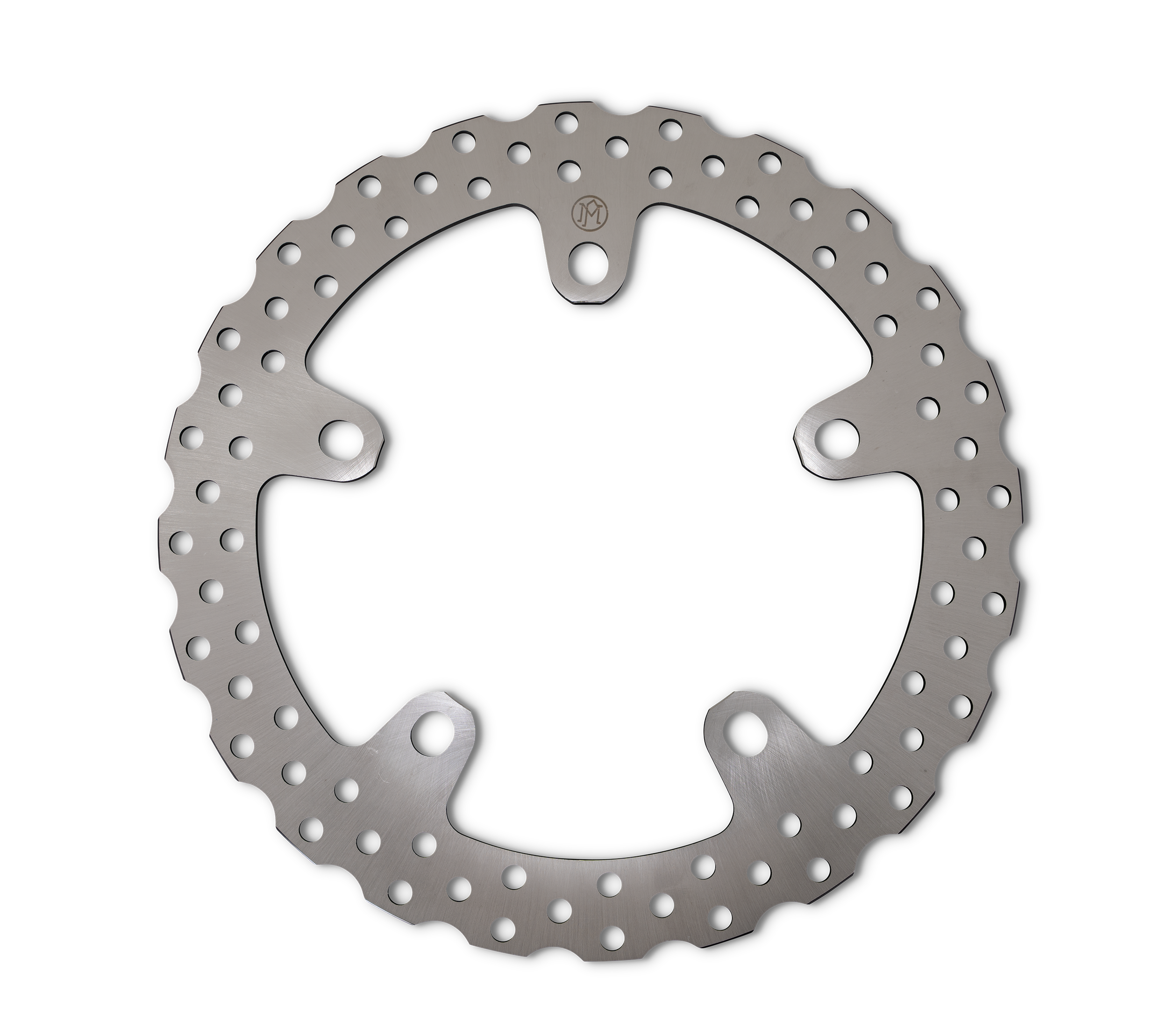 Performance Machine Spoke Mount Rotors are CNC precision ground to ensure a flat and parallel surface. Hardened 420 stainless steel disc meets RC36 specifications. Semi-floating design yields a rotor with a higher resistance to wear, warping and rotor deformation. The scallop cut braking surface is drilled in a sweep pattern for optimal heat dissipation with a reduction in weight. Spoke Mount Rotors are designed for use with stock front wheels and calipers on H-D Touring models. Available as a stock replacement disc for front left and right applications.